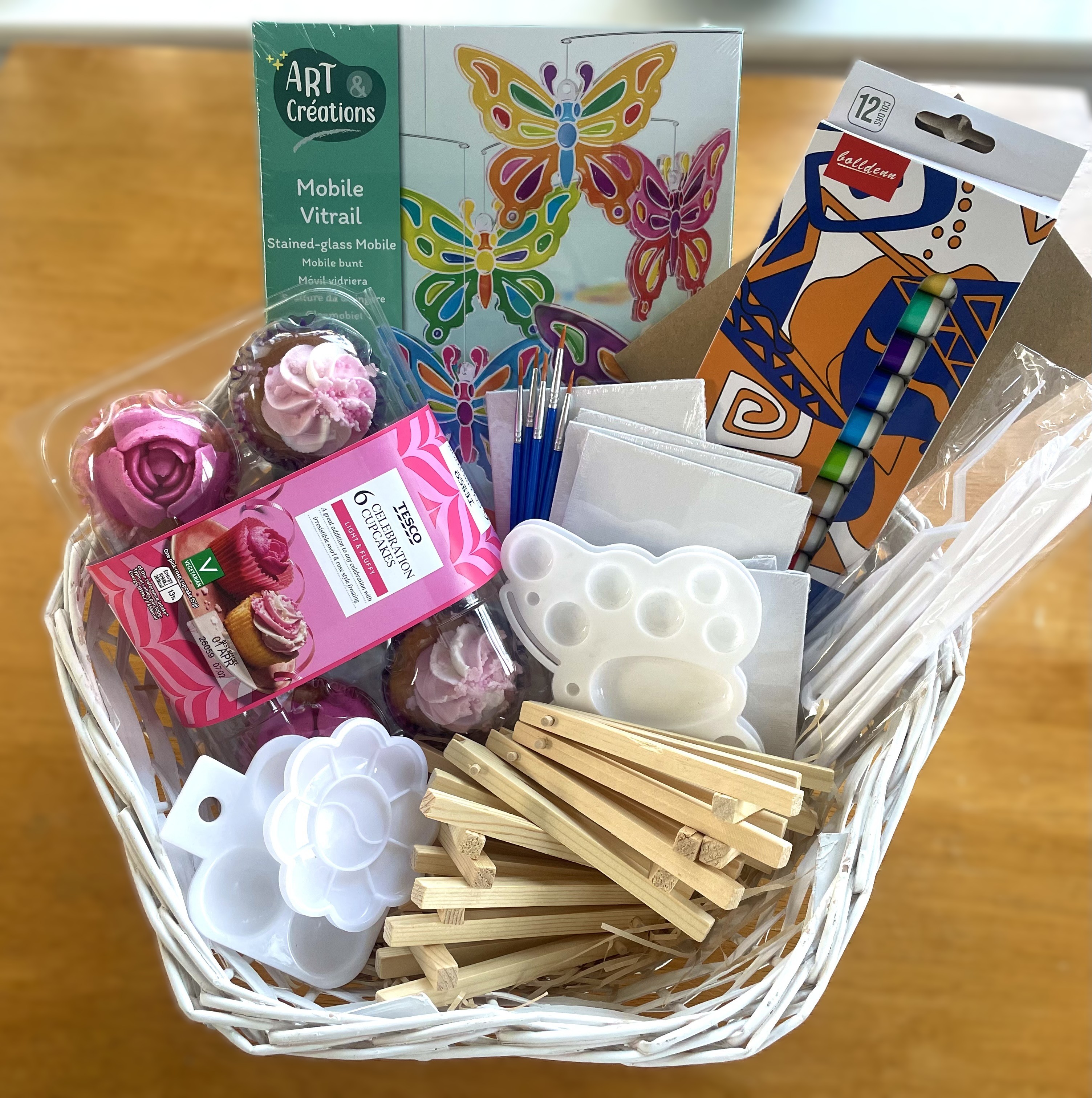 We gifted Mabel an arts and crafts hamper filled with acrylic paints, canvases, a butterfly stained glass mobile, and some pink cupcakes. A gift that reflects her creativity and love for making, adding a special touch to her birthday celebrations and giving her something she truly enjoys.